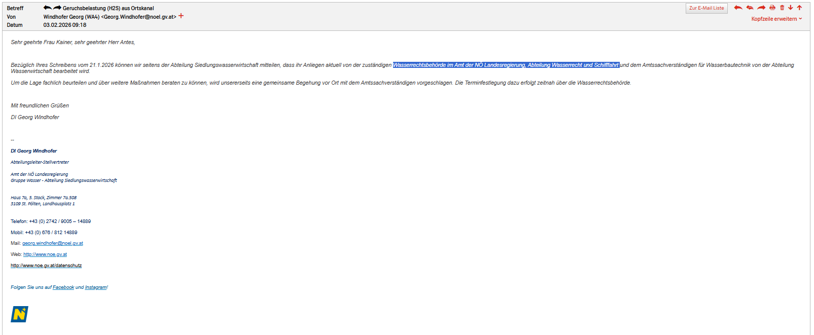 Bezüglich Ihres Schreibens vom 21.1.2026 können wir seitens der Abteilung Siedlungswasserwirtschaft mitteilen, dass ihr Anliegen aktuell von der zuständigen Wasserrechtsbehörde im Amt der NÖ Landesregierung, Abteilung Wasserrecht und Schifffahrt und dem Amtssachverständigen für Wasserbautechnik von der Abteilung Wasserwirtschaft bearbeitet wird.